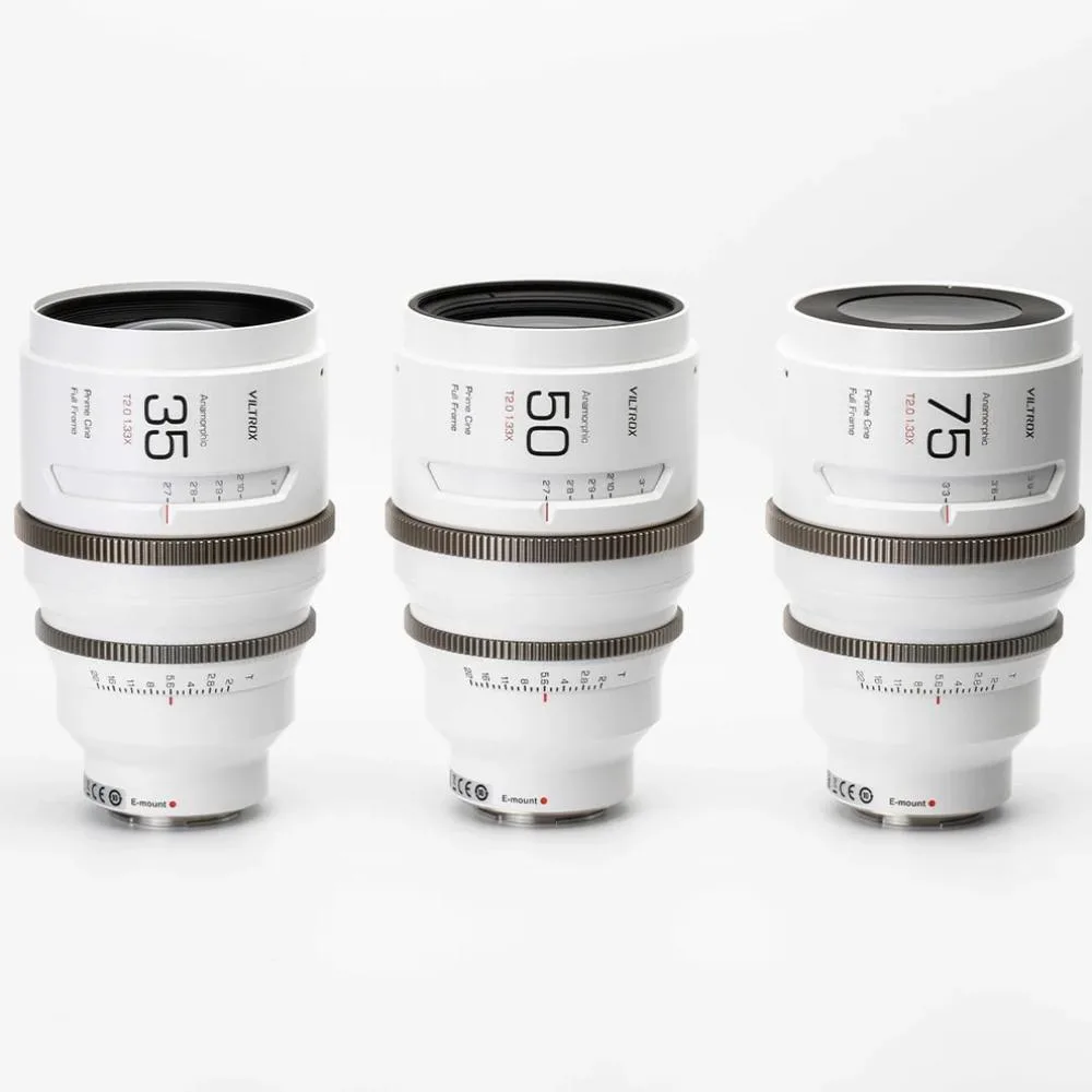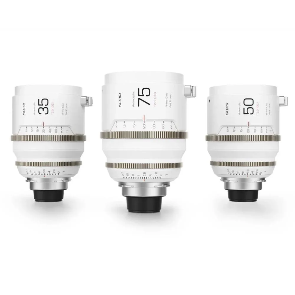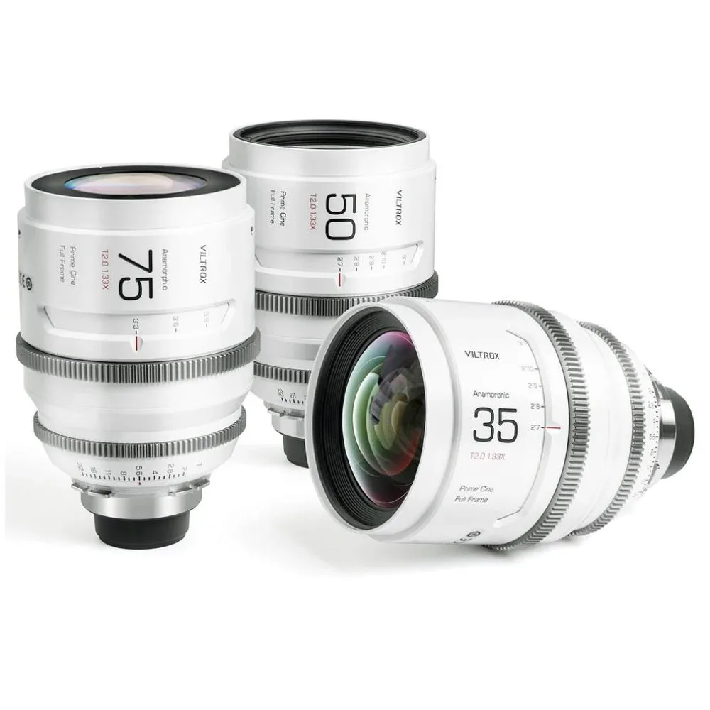 Viltrox EPIC 35/50/75mm T2.0 PL Κιτ. Κιτ τριών αναμορφικών κινηματογραφικών φακών full frame μοντούρας ARRI PL σε εστιακές αποστάσεις 35 mm, 50 mm και 75 mm, όλοι με διάφραγμα Τ2.0  και λόγο συμπίεσης 1,33x. Οι φακοί είναι σε λευκό χρώμα και παραδίδονται σε βαλιτσάκι με αφρώδη επένδυση.