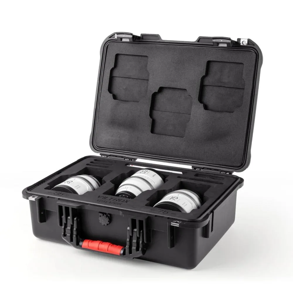 Περιεχόμενα συσκευασίας: Viltrox EPIC 35/50/75mm T2.0 PL Κιτ που αποτελείται από φακούς 35 mm, 50 mm και 75 mm μοντούρας PL και διαφράγματος T2.0, βαλιτσάκι μεταφοράς, οπίσθια ροδέλα ρύθμισης εστίασης, φορέας συγκράτησης φακού, κατσαβίδι